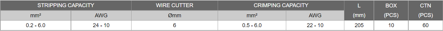 Fully automatic cable strippers, wire cutters and crimping pliers Strip and cut wires/cable from 0.2 – 6.0 mm² (24-10 AWG) Crimp 0.5-6 mm² (22-10 AWG) insulated & non-insulated terminals Crimp 7-8mm ignition terminals A micro adjustable knob for adjusting strip wire from 0.05 mm² (30 AWG) up to 8 mm² (8 AWG) ABS adjustable stopper for quickly setting the length of stripping wire Spring-loaded return for quick repetitive opening Ergonomic comfort-grip handle