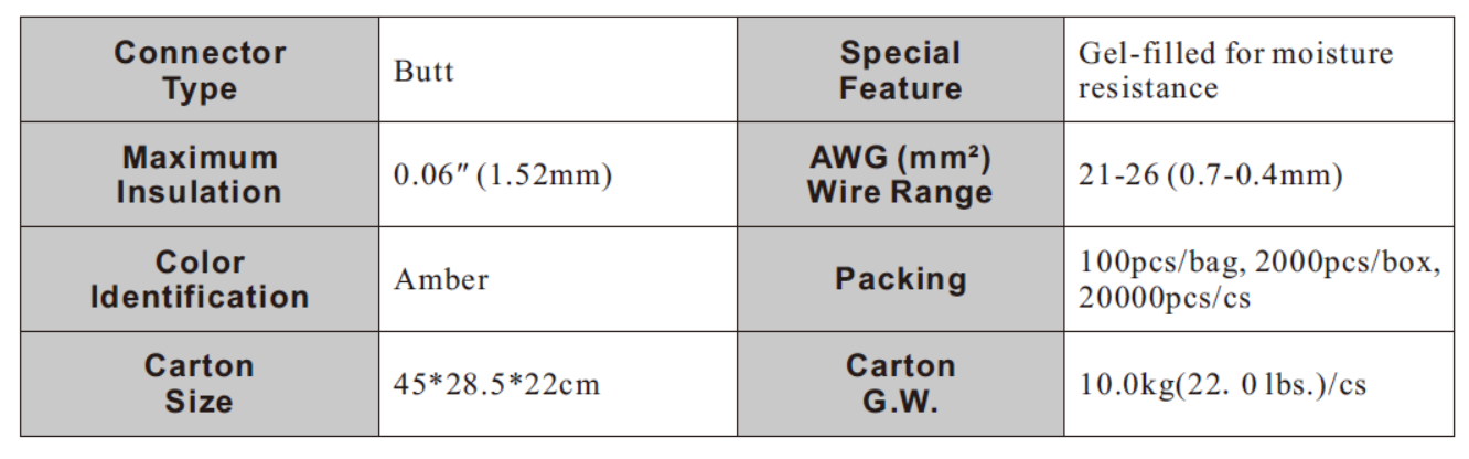 - The butt connector is designed for 0.4mm-0.9mm copper wires with max insulation diameters 2.08mm.